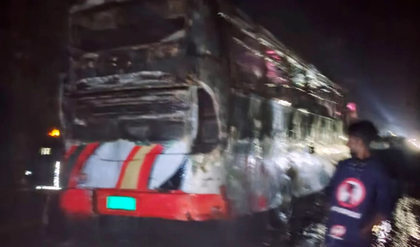 Kamalnagar Fire Service Station Officer Rakibul Hasan stated that the fire started due to the engine overheating. No passengers were injured. Approximately 80 percent of the bus was destroyed.