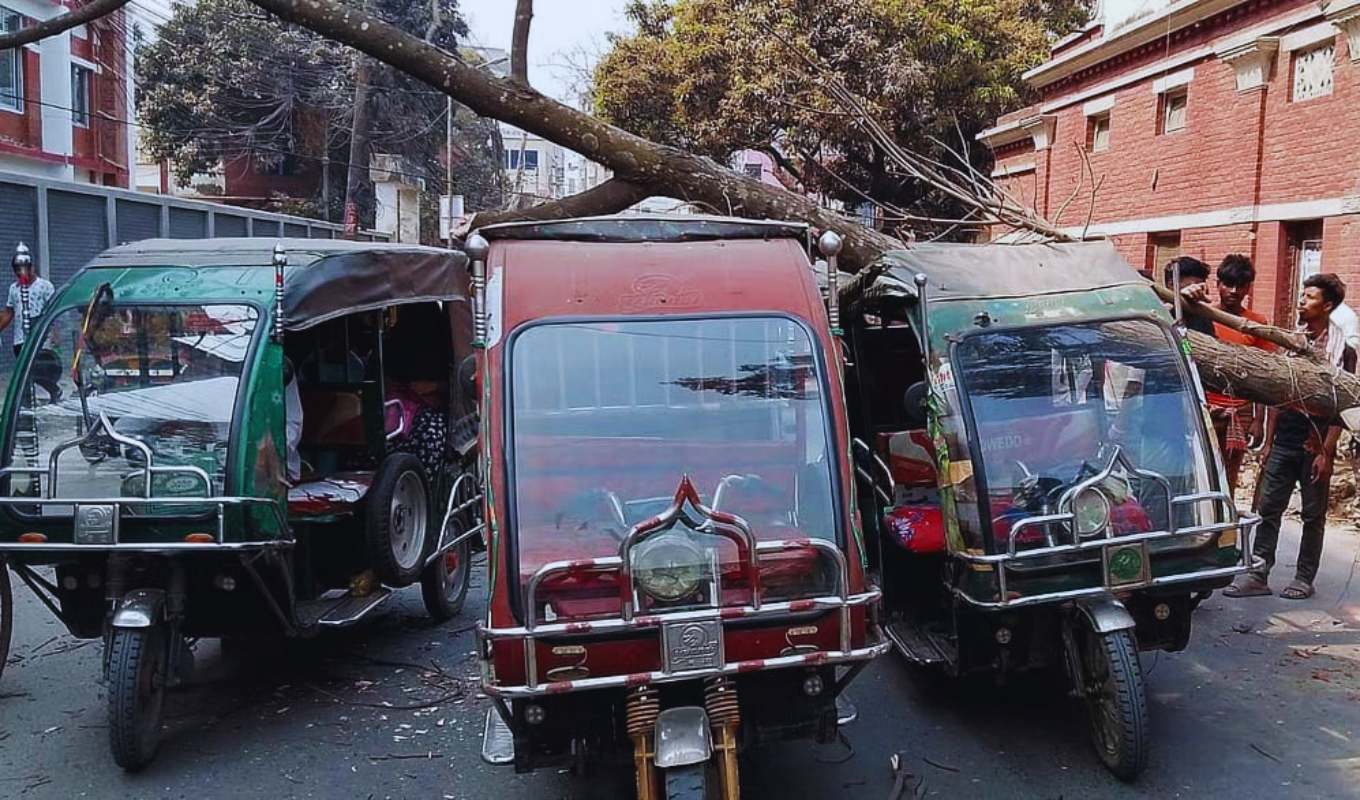Rickshaw driver Mamun Mia, whose vehicle was among those damaged, described the harrowing incident: “I was carrying passengers along that road when the tree suddenly fell onto my rickshaw and two others. The roofs of my rickshaw and Chunnu Bappari’s were completely smashed, while Tushar Bappari’s rickshaw also sustained damage. Thankfully, no passengers or drivers were injured.”