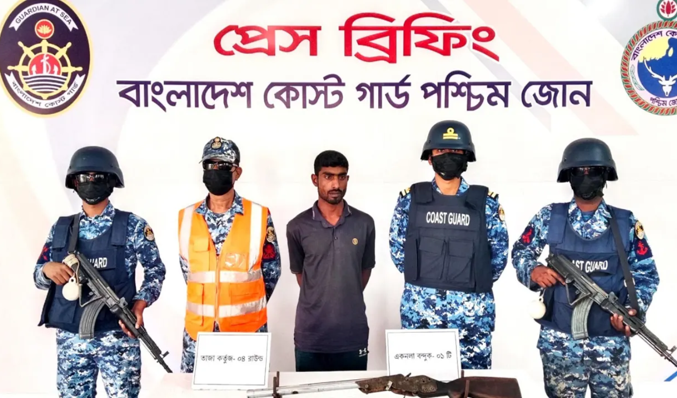 In a significant operation in the Sundarbans, the Bangladesh Coast Guard has apprehended an active member of the notorious Doyal gang. Based on information provided by the suspect, authorities recovered a firearm and four rounds of live ammunition.