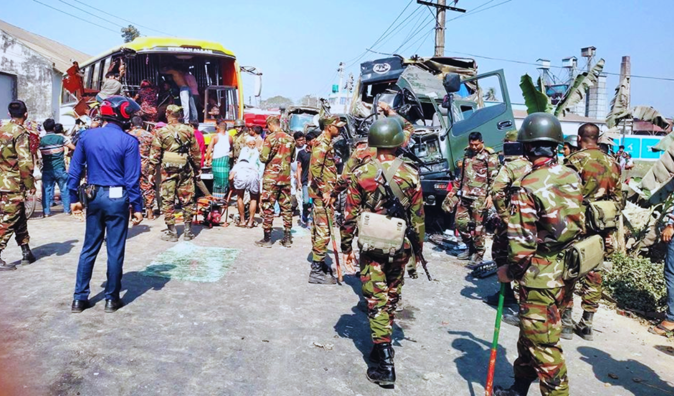 According to Officer-in-Charge of Fulpur Police Station, Rashedul Hasan, the army truck was returning to Mymensingh after completing camp operations in Fulpur. On its route, it collided head-on with a Sherpur-bound bus. The impact crushed the front sections of both vehicles, causing serious injuries to numerous passengers.